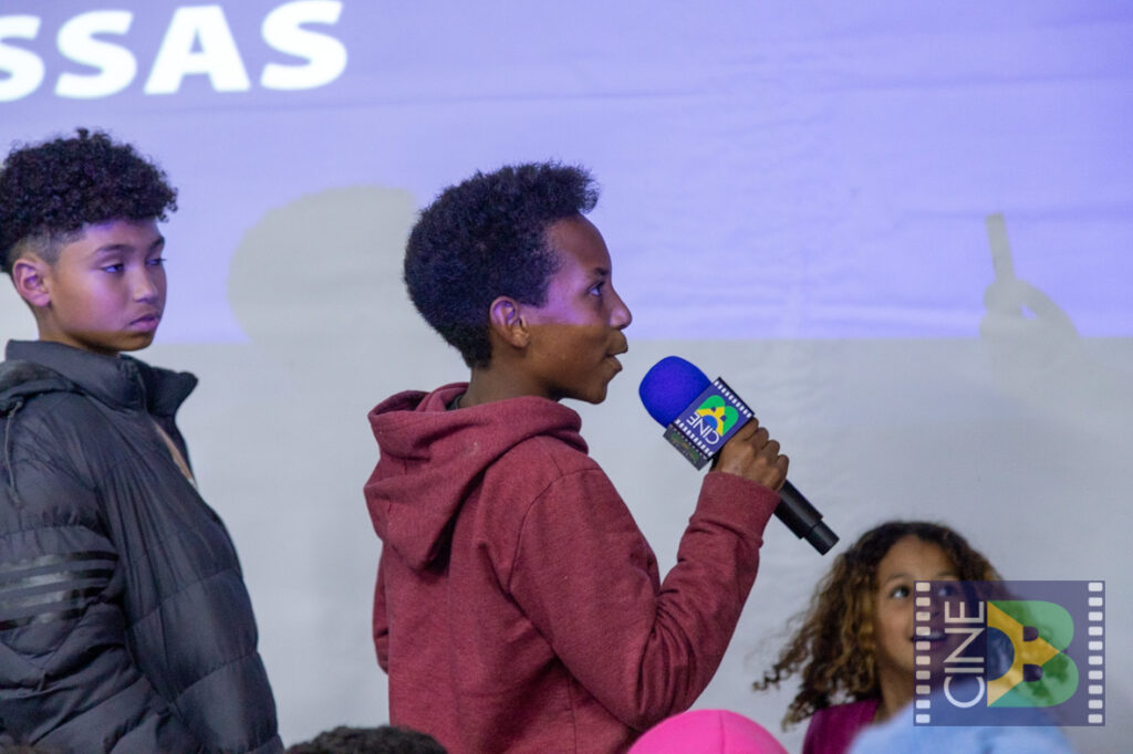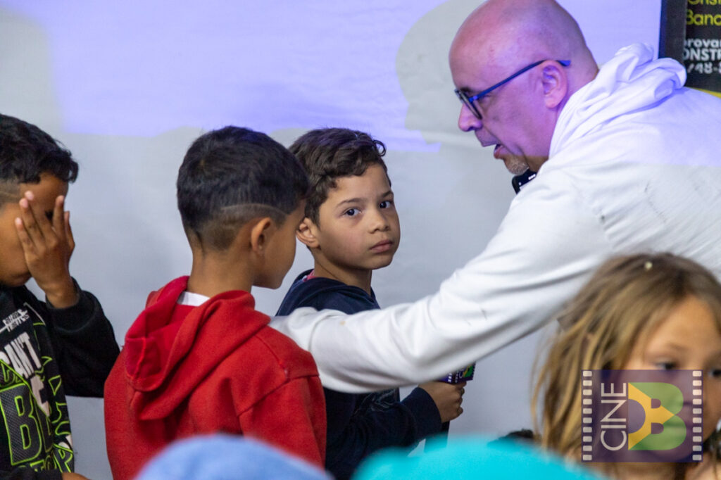 Pipoca quentinha, friozinho típico de setembro e muito entusiasmo marcaram a sessão, que terminou com sorteio de camisetas e perguntas e respostas com as crianças.