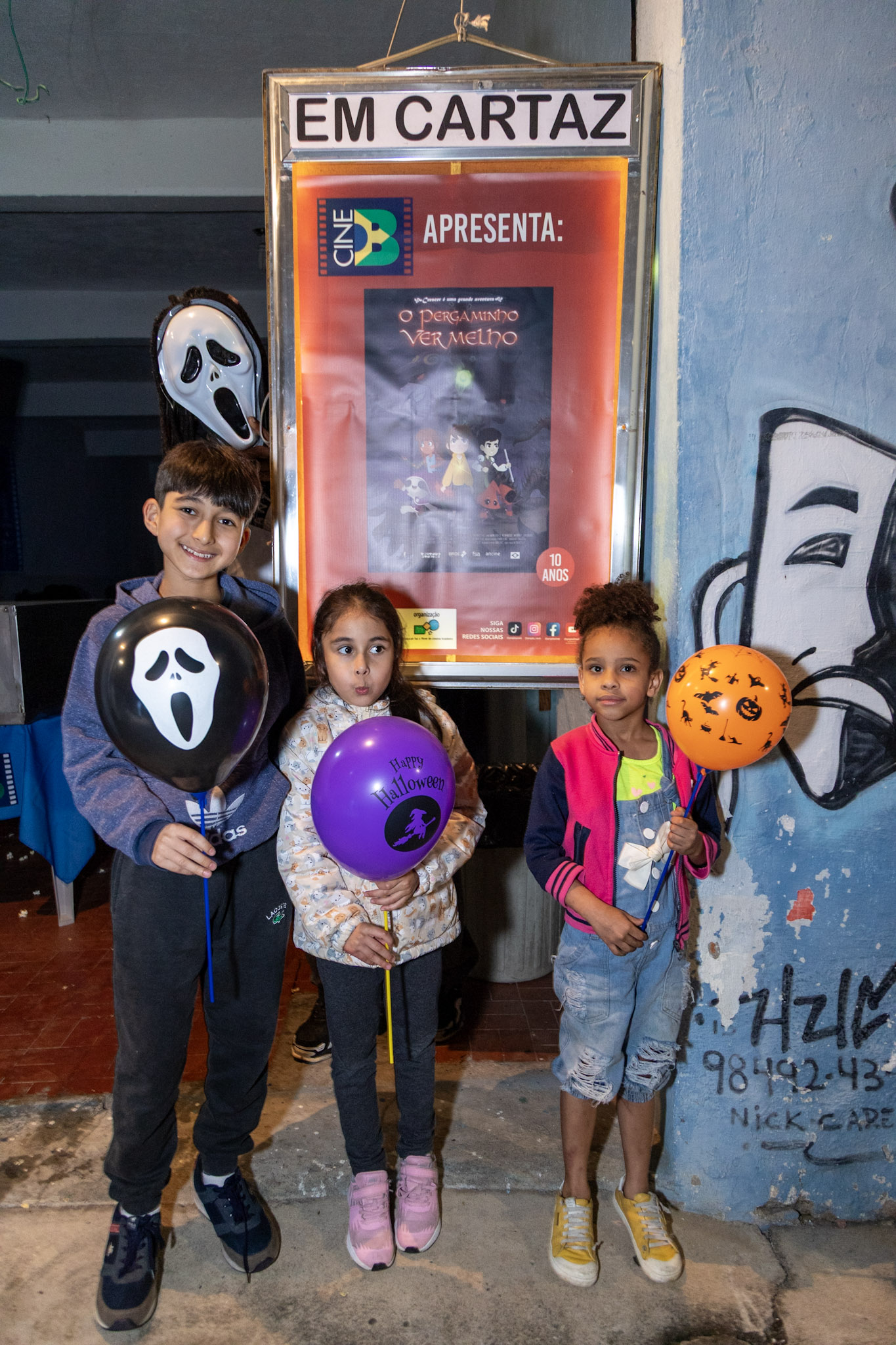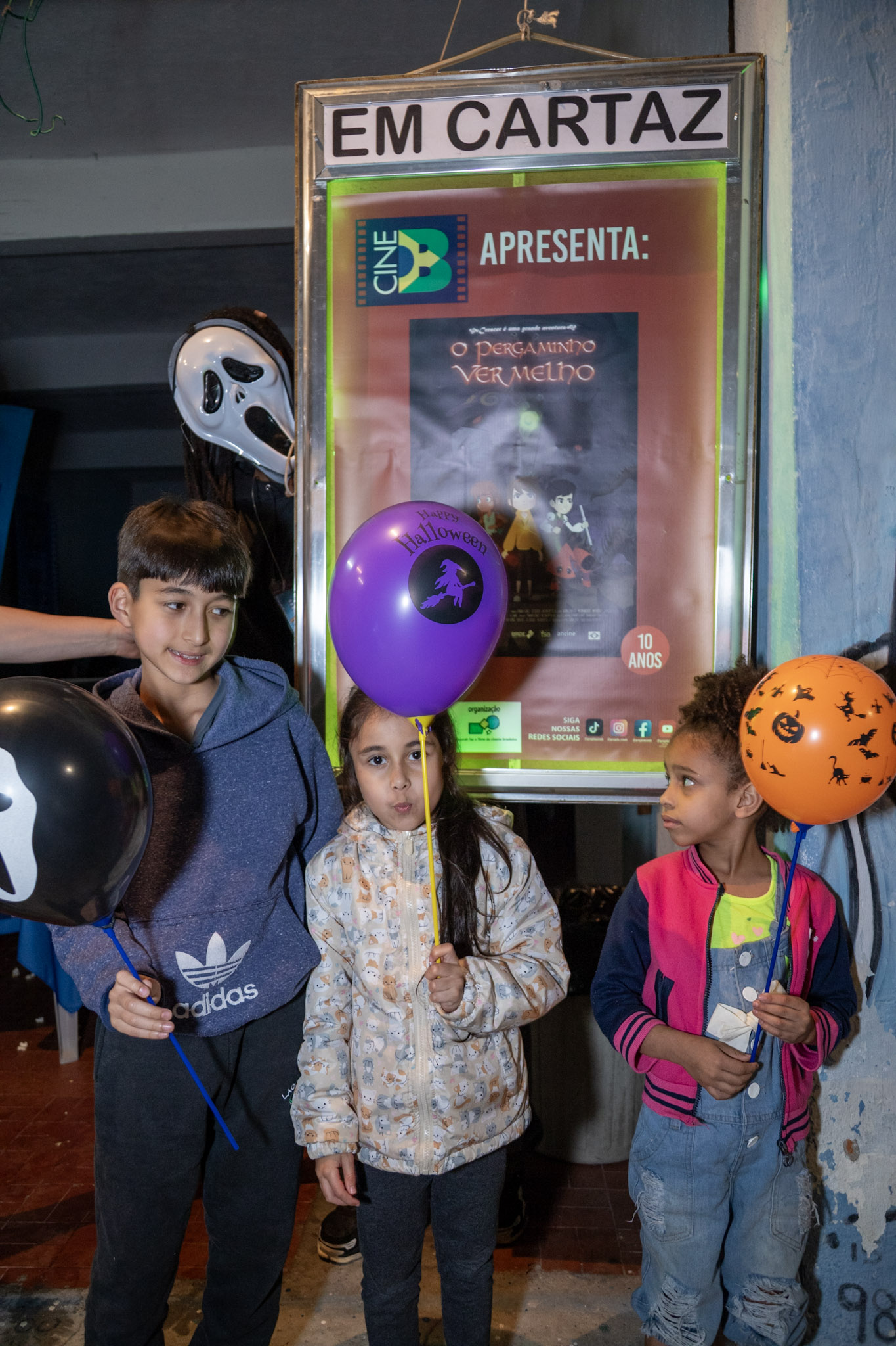 Após o filme, houve um breve debate com as crianças — que responderam perguntas no telão —, seguido de mais pipoca e distribuição de bexigas personalizadas de Halloween.