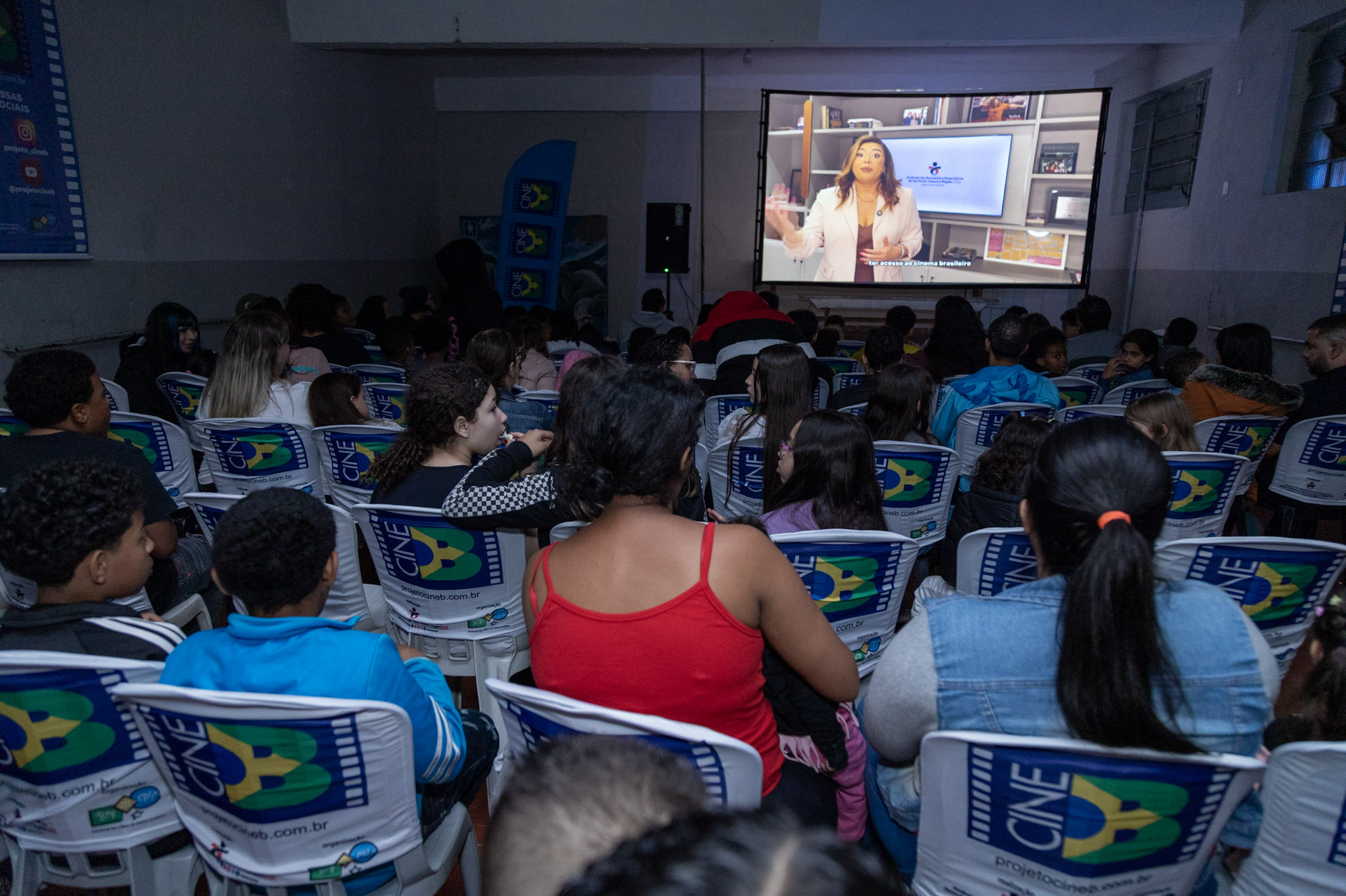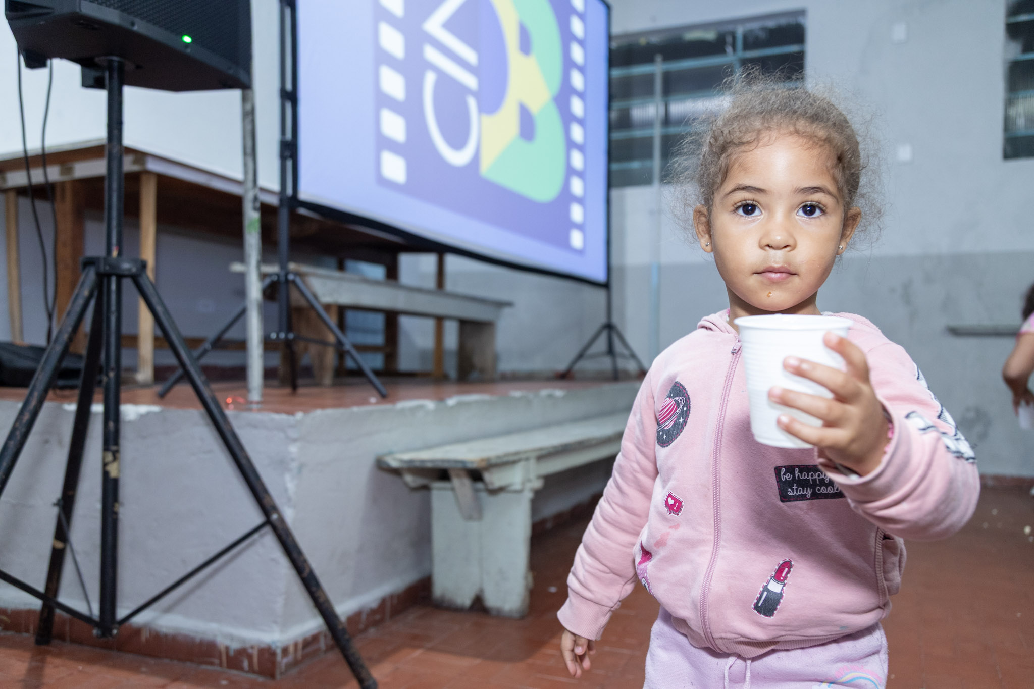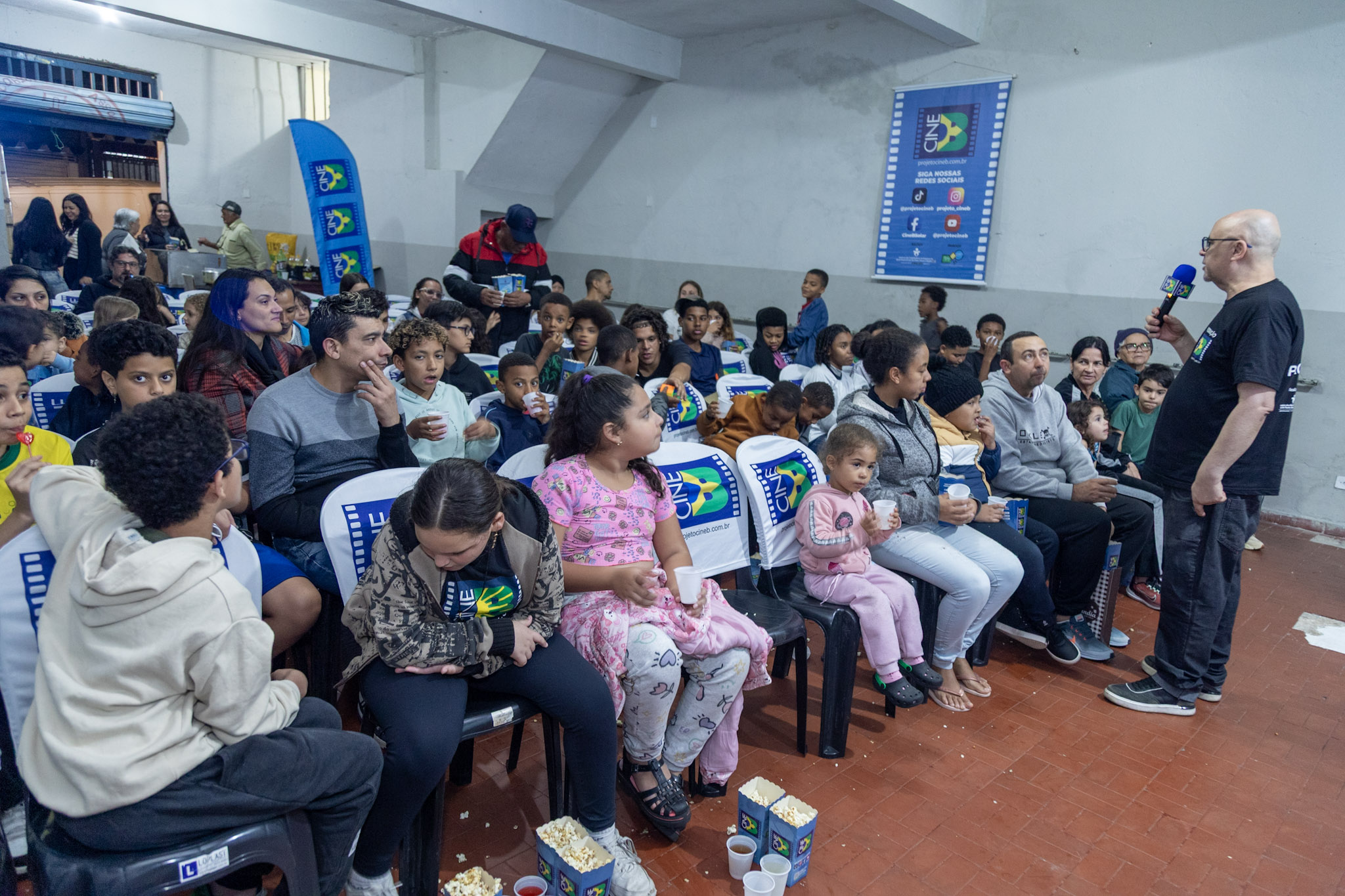 Pela 18ª vez na comunidade, o CineB lota a Sociedade Amigos da Vila Rica – desta vez com seu primeiro filme infantil no bairro, reunindo crianças de escolas locais e famílias para uma noite de cinema, pipoca e debate.