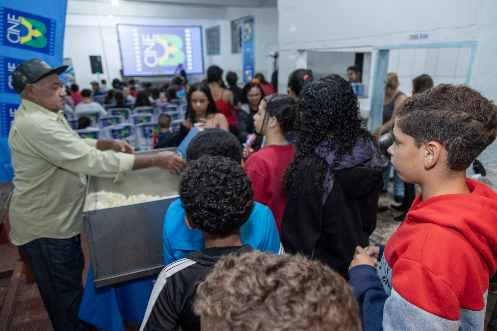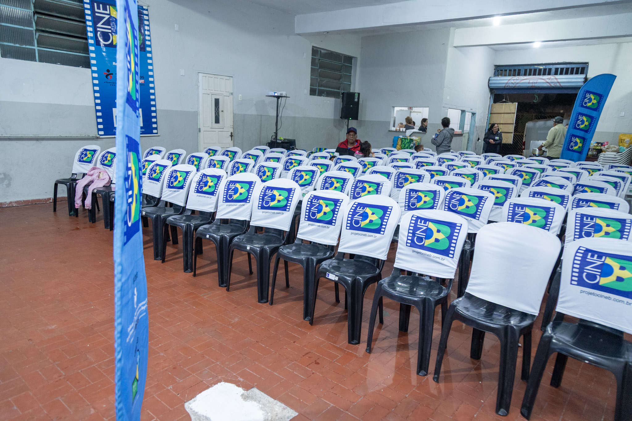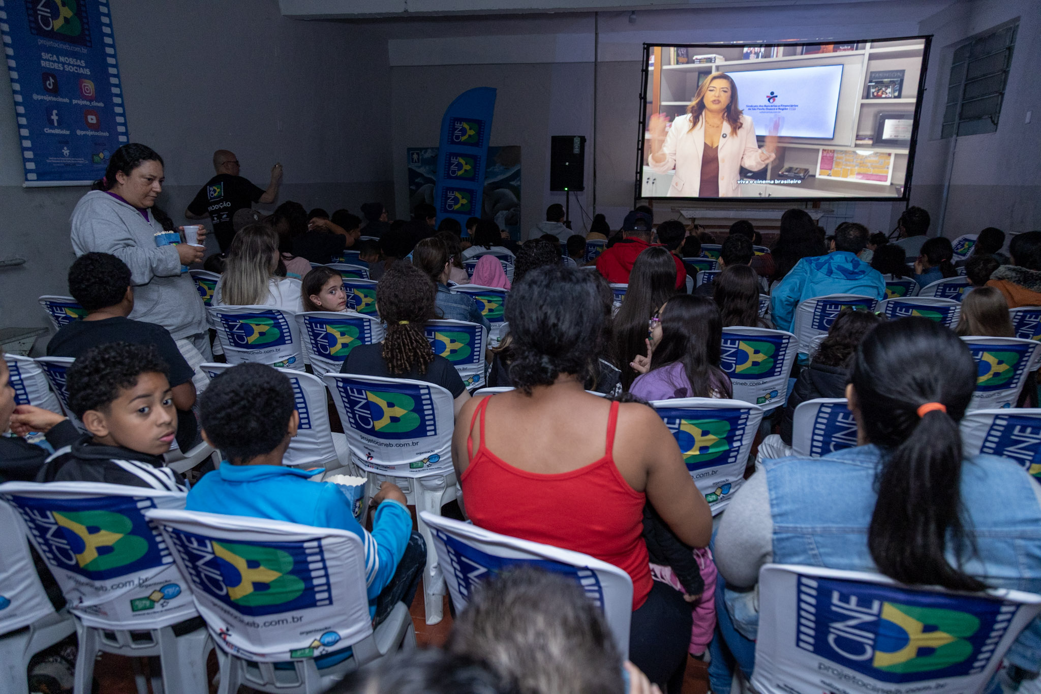 Pela 18ª vez na comunidade, o CineB lota a Sociedade Amigos da Vila Rica – desta vez com seu primeiro filme infantil no bairro, reunindo crianças de escolas locais e famílias para uma noite de cinema, pipoca e debate.