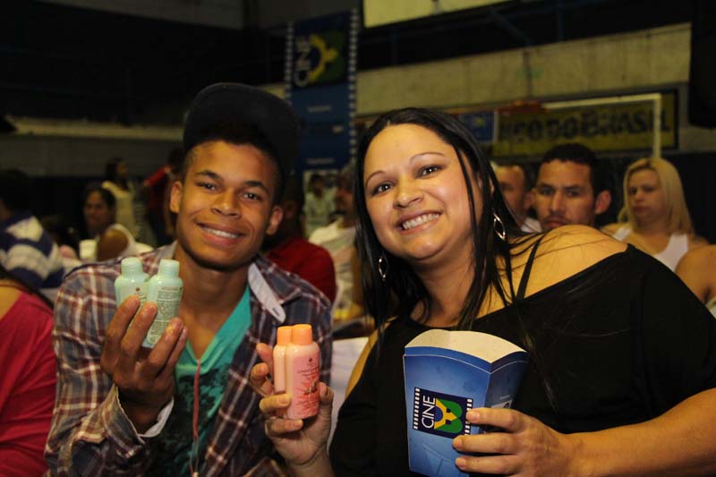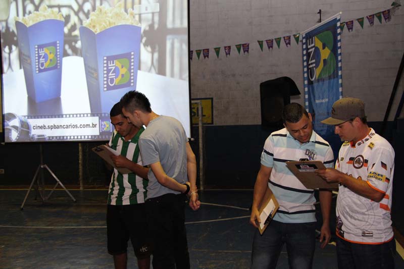Antes do início sa sessão, já com pipoca grátis para todo mundo, rolou uma brincadeira. Quatro duplas foram selecionadas para uma competição: aquela que colocasse no papel mais nomes de filmes brasileiros ganhava um brinde.